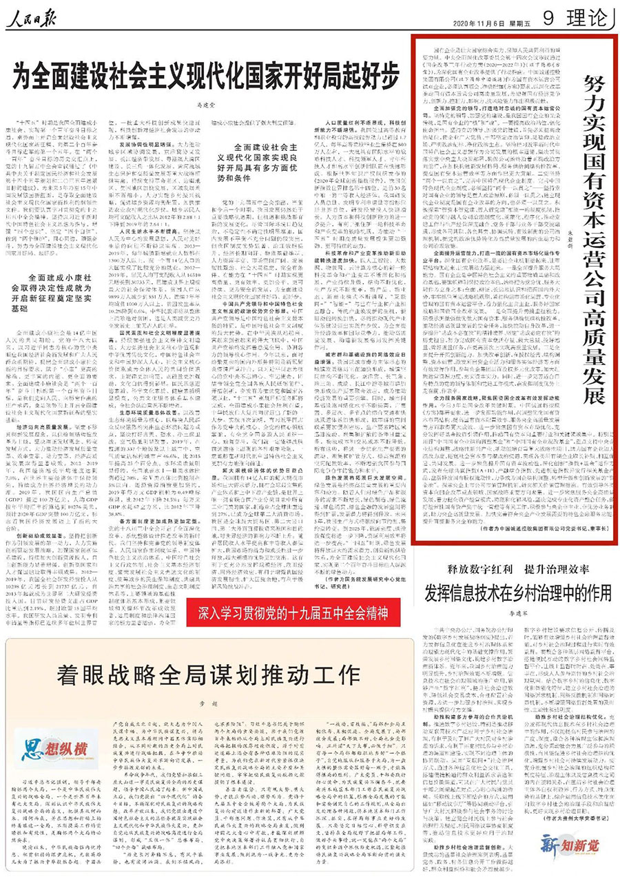 2020年11月6日出版的《人民日报》理论版,刊发了中国诚通集团党委书记、董事长朱碧新的署名文章《努力实现国有资本运营公司高质量发展》一文。全文如下: